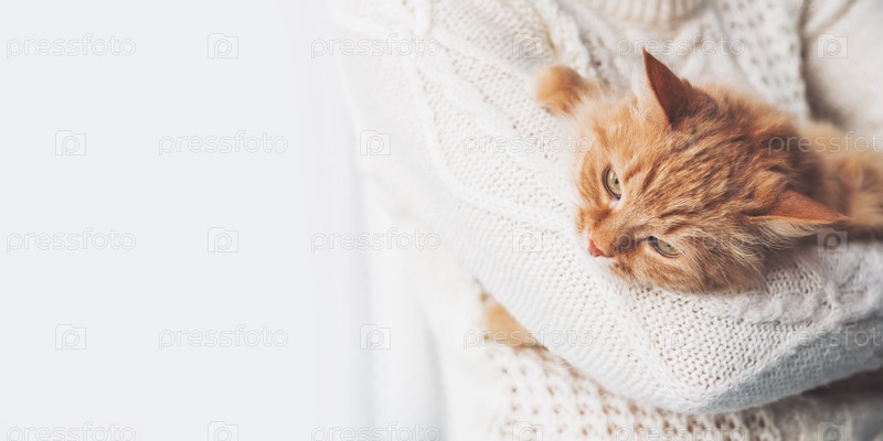 Женщина в белом вязаном свитере держит на руках рыжего кота. Пушистый питомец с недовольным выражением лица. Светлый баннер с копией пространства
