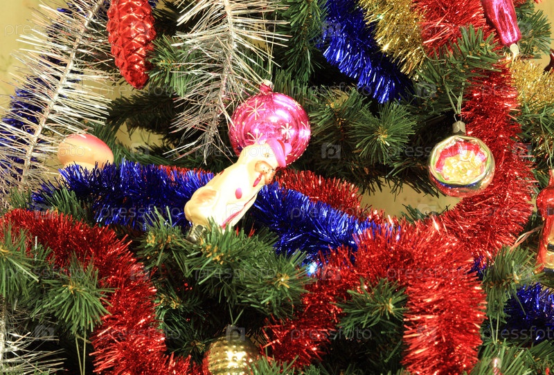 Игрушки на зеленой рождественской ели