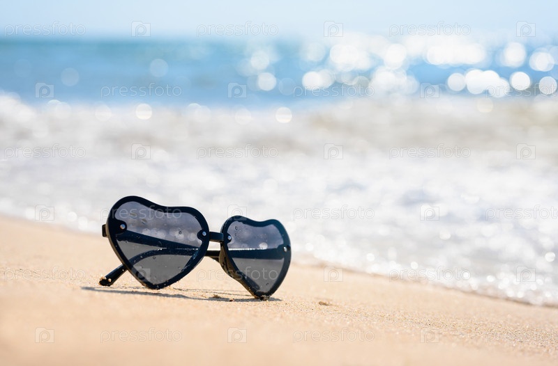 Солнцезащитные очки на пляже возле морских волн. Выборочный фокус, узкий фокус