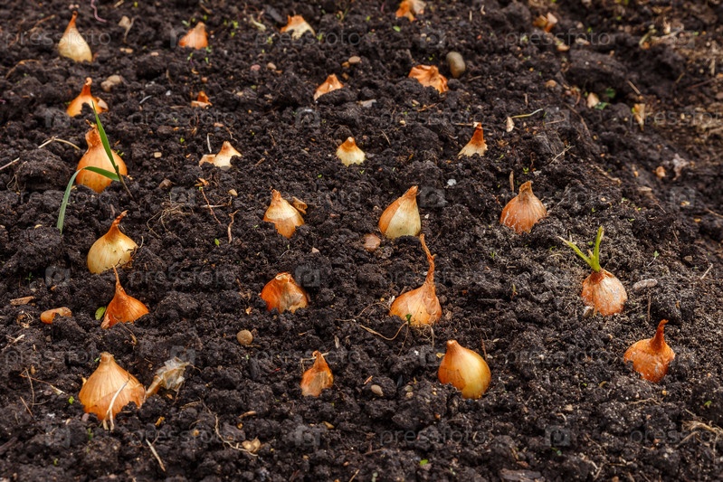 лук в саду. Посадка лука на грядке. Садоводство
