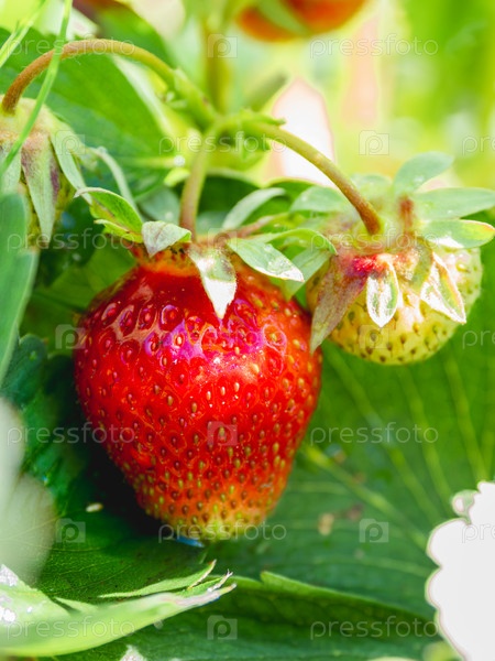 Красная и зеленая клубника под листьями. Солнечный день в саду с растущими ягодами. сельское хозяйство