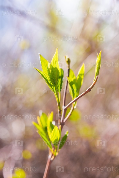 Весенний фон со свежими зелеными листьями, появляющимися из почек. Ветви деревьев на солнце