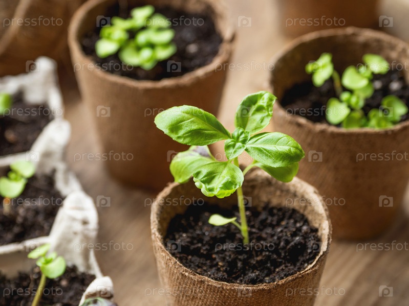 Саженцы базилика в биоразлагаемых горшках на деревянном столе. Зеленые растения в торфяных горшках. Подготовка небольших растений к садоводческому весеннему сезону