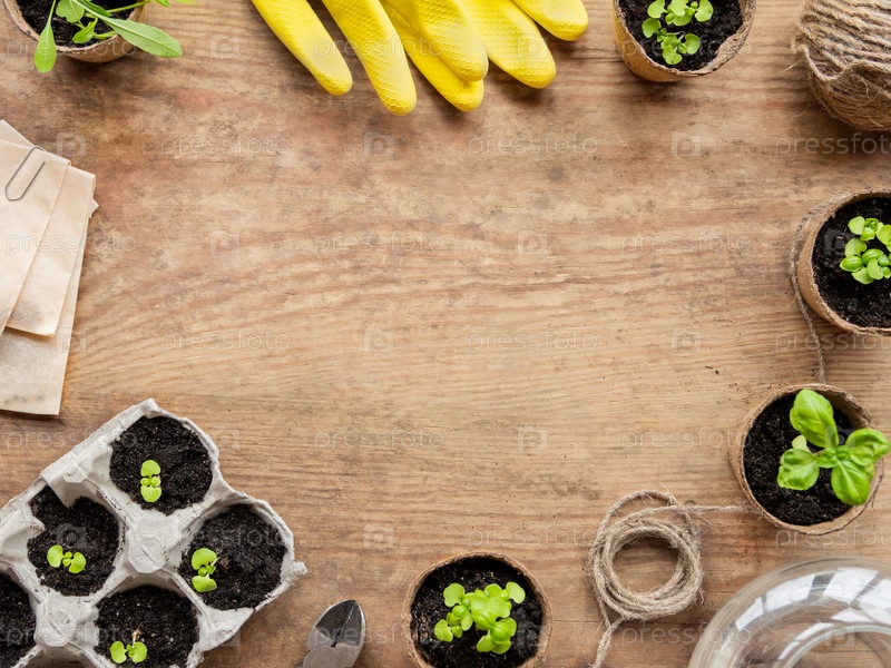 Саженцы базилика в биоразлагаемых горшках и желтых резиновых перчатках. Вид сверху на зеленые растения и сельскохозяйственные инструменты. Скопируйте место на деревянном столе