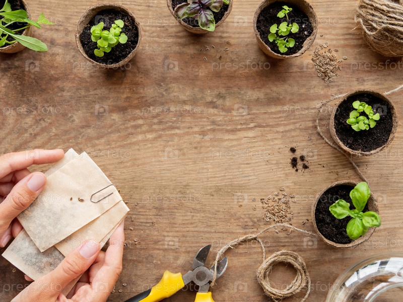 Саженцы базилика в биоразлагаемых горшках. Женщина держит бумажные пакеты с семенами. Вид сверху на зеленые растения в торфяных горшках и сельскохозяйственные инструменты. Скопируйте место на деревянном столе