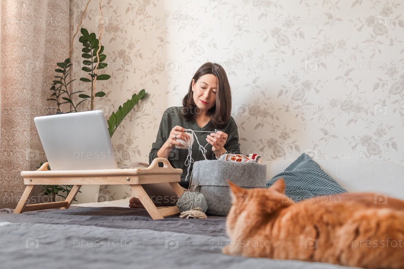 Рыжая кошка смотрит, как женщина вяжет крючком, смотря фильм на ноутбуке. Учитесь вязать по видео урокам в интернете. Уютный дом и антистрессовое хобби