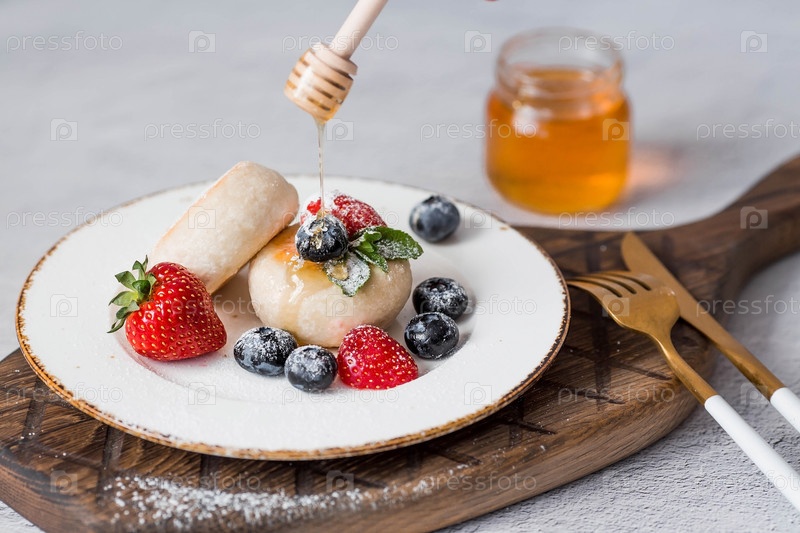 Блины с творогом, русские сырники со свежей черникой, клубникой, медом и листьями мяты на стильной деревянной доске на сером бетонном столе. Натуральные продукты. Здоровый и вкусный завтрак