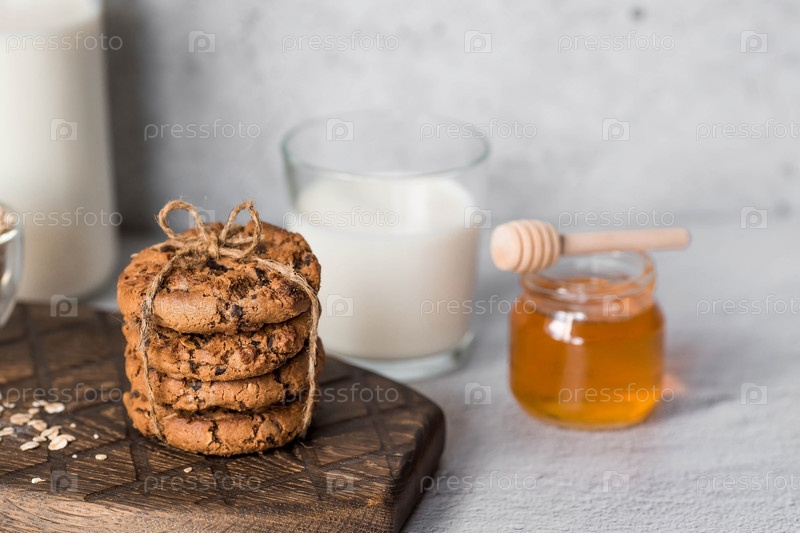 Органическое натуральное коровье молоко в стеклянной бутылке, овсянка, мед и овсяное печенье на стильной деревянной доске на каменном столе. Натуральные экологически чистые продукты