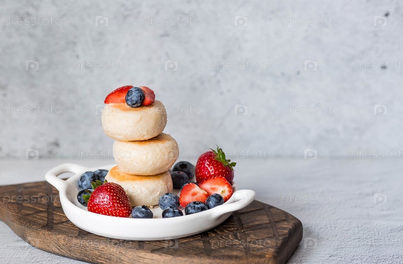 Блинчики с творогом, русские сырники со свежей черникой, клубникой и мятой на стильной деревянной доске на сером бетонном столе. Натуральные продукты. Здоровый и вкусный завтрак