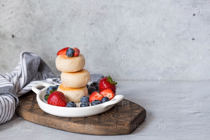 Блинчики с творогом, русские сырники со свежей черникой, клубникой и мятой на стильной деревянной доске на сером бетонном столе. Натуральные продукты. Здоровый и вкусный завтрак