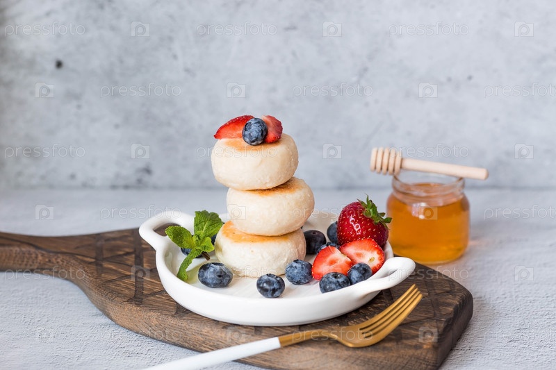 Блины с творогом, русские сырники со свежей черникой, клубникой, медом и листьями мяты на стильной деревянной доске на сером бетонном столе. Натуральные продукты. Здоровый и вкусный завтрак