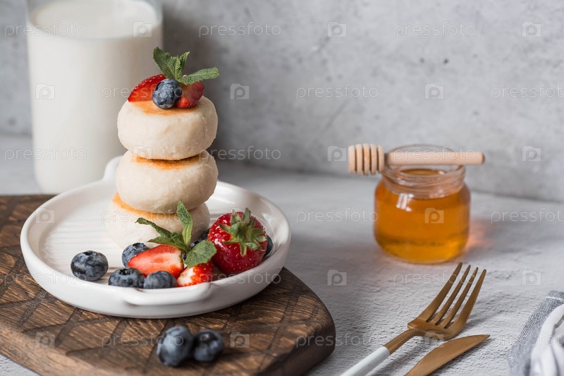 Блины с творогом, русские сырники со свежей черникой, клубникой, медом и листьями мяты на стильной деревянной доске на сером бетонном столе. Натуральные продукты. Здоровый и вкусный завтрак
