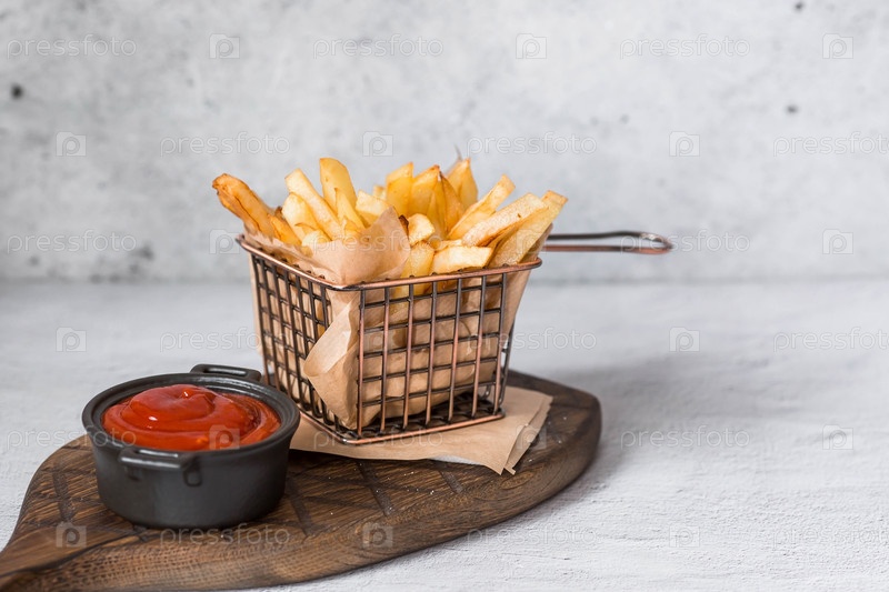 Картофель фри в металлической корзине с солью и кетчупом на стильной доске на бетонном кухонном столе. Жареная картошка. Концепция фаст-фуда и нездоровой пищи