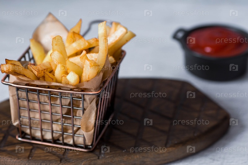 Картофель фри в металлической корзине с солью и кетчупом на стильной доске на бетонном кухонном столе. Жареная картошка. Концепция фаст-фуда и нездоровой пищи