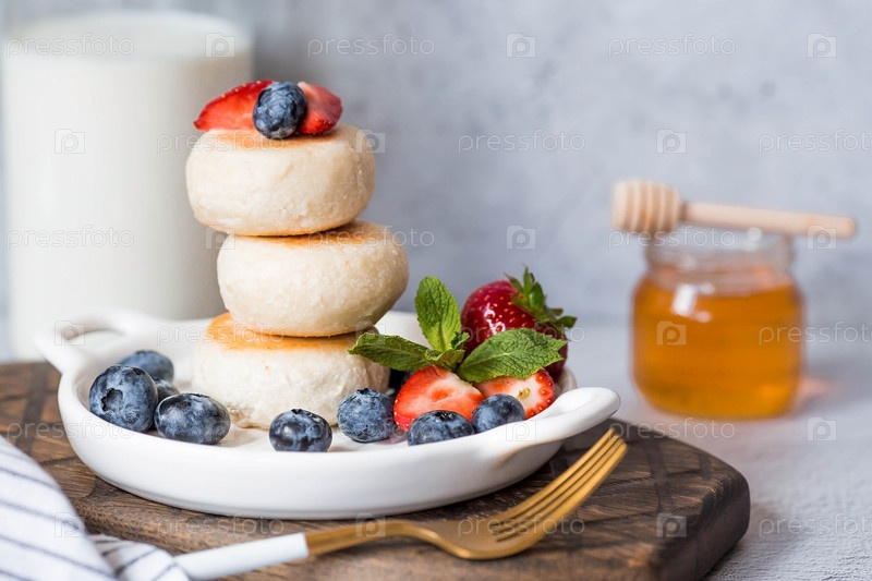 Блины с творогом, русские сырники со свежей черникой, клубникой, медом и листьями мяты на стильной деревянной доске на сером бетонном столе. Натуральные продукты. Здоровый и вкусный завтрак