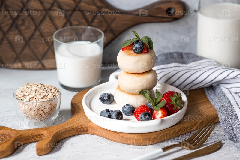 Блинчики с творогом, русские сырники со свежей черникой, клубникой и мятой на стильной деревянной доске на сером бетонном столе. Натуральные продукты. Здоровый и вкусный завтрак