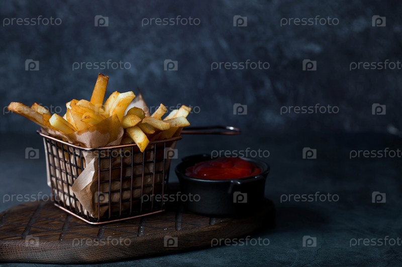 Картофель фри в металлической корзине с солью и кетчупом на стильной доске на темном фоне. Жареная картошка. Концепция фаст-фуда и нездоровой пищи