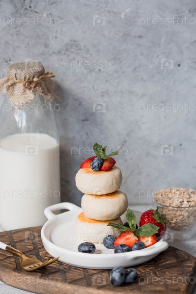 Блинчики с творогом, русские сырники со свежей черникой, клубникой и мятой на стильной деревянной доске на сером бетонном столе. Натуральные продукты. Здоровый и вкусный завтрак