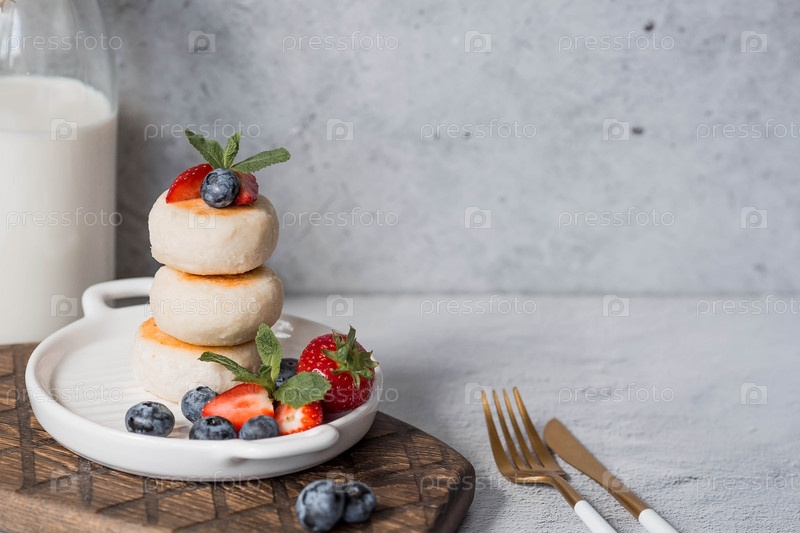 Блинчики с творогом, русские сырники со свежей черникой, клубникой и мятой на стильной деревянной доске на сером бетонном столе. Натуральные продукты. Здоровый и вкусный завтрак