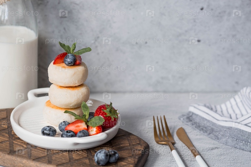 Блинчики с творогом, русские сырники со свежей черникой, клубникой и мятой на стильной деревянной доске на сером бетонном столе. Натуральные продукты. Здоровый и вкусный завтрак