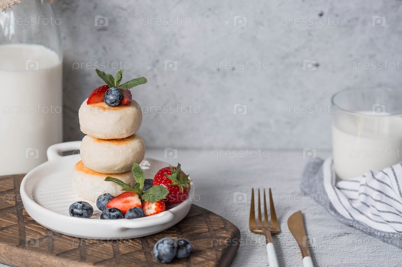 Блинчики с творогом, русские сырники со свежей черникой, клубникой и мятой на стильной деревянной доске на сером бетонном столе. Натуральные продукты. Здоровый и вкусный завтрак