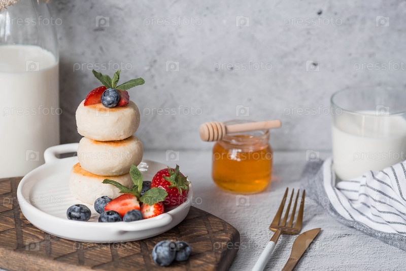 Блины с творогом, русские сырники со свежей черникой, клубникой, медом и листьями мяты на стильной деревянной доске на сером бетонном столе. Натуральные продукты. Здоровый и вкусный завтрак