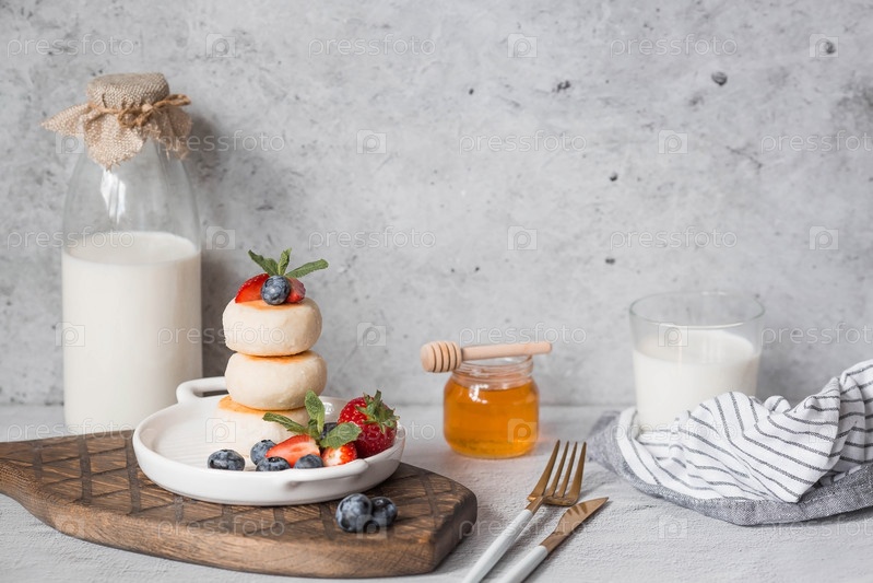 Блины с творогом, русские сырники со свежей черникой, клубникой, медом и листьями мяты на стильной деревянной доске на сером бетонном столе. Натуральные продукты. Здоровый и вкусный завтрак