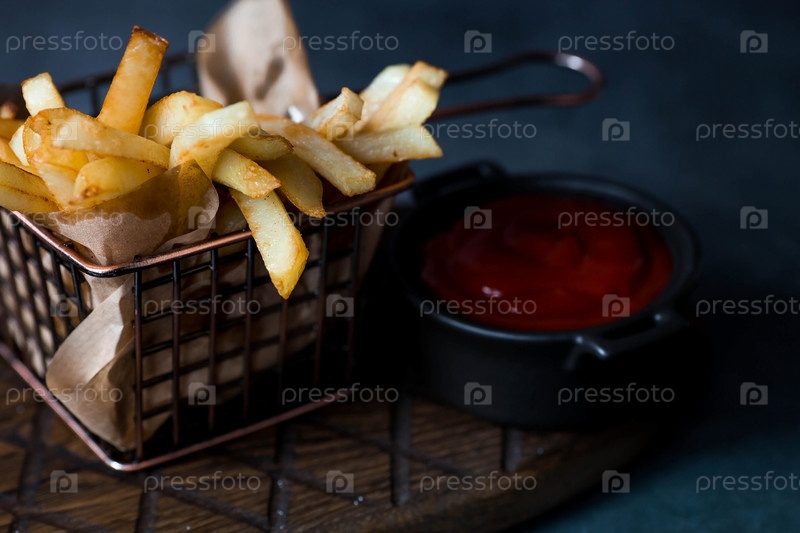 Картофель фри в металлической корзине с солью и кетчупом на стильной доске на темном фоне. Жареная картошка. Концепция фаст-фуда и нездоровой пищи