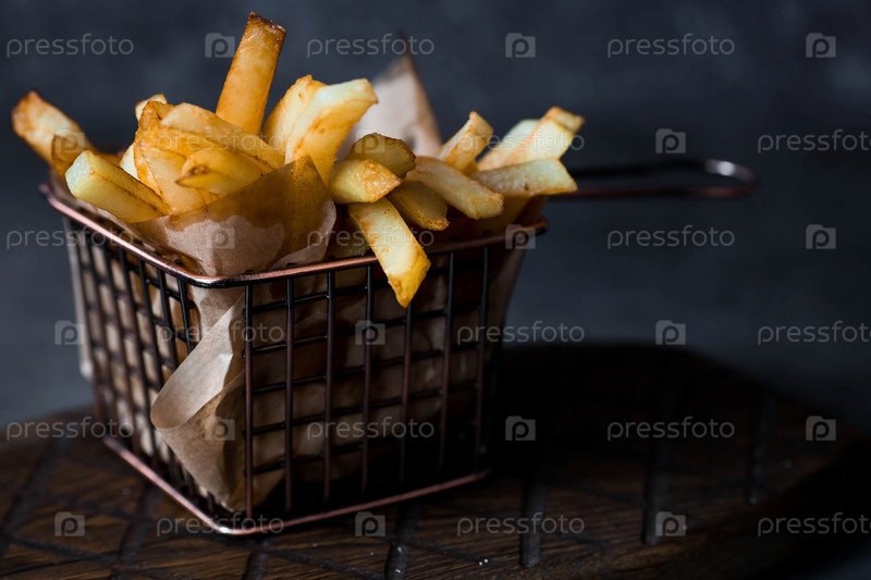 Картофель фри в металлической корзине с солью на стильной доске на темном фоне. Жареная картошка. Концепция фаст-фуда и нездоровой пищи