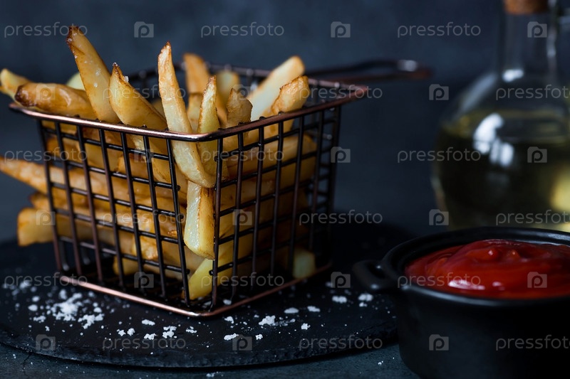 Картофель фри в металлической корзине с солью, кетчупом и подсолнечным маслом на стильной доске на темном фоне. Жареная картошка. Концепция фаст-фуда и нездоровой пищи