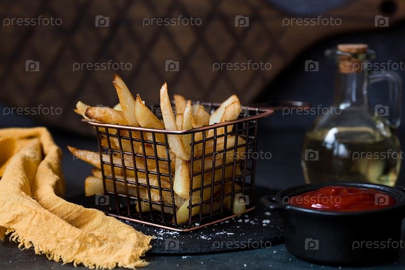 Картофель фри в металлической корзине с солью, кетчупом и подсолнечным маслом на стильной доске на темном фоне. Жареная картошка. Концепция фаст-фуда и нездоровой пищи