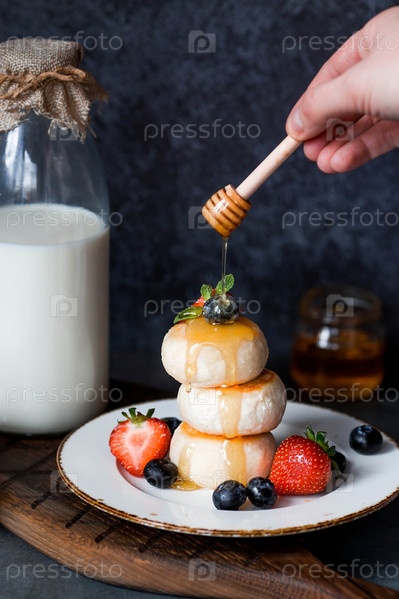 Блины с творогом, русские сырники со свежей черникой, клубникой, медом и листьями мяты на стильной деревянной доске на темном фоне. Натуральные продукты. Здоровый и вкусный завтрак
