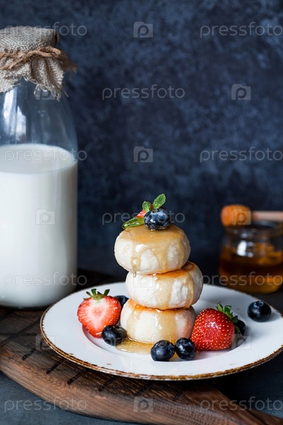Блины с творогом, русские сырники со свежей черникой, клубникой, медом и листьями мяты на стильной деревянной доске на темном фоне. Натуральные продукты. Здоровый и вкусный завтрак