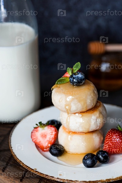 Блины с творогом, русские сырники со свежей черникой, клубникой, медом и листьями мяты на стильной деревянной доске на темном фоне. Натуральные продукты. Здоровый и вкусный завтрак