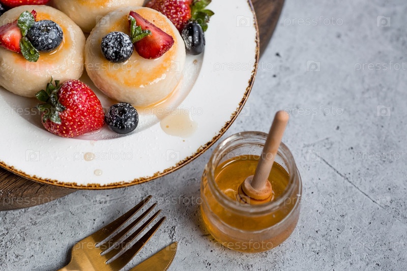 Блины с творогом, русские сырники со свежей черникой, клубникой, медом и листьями мяты на стильной деревянной доске на сером бетонном столе. Натуральные продукты. Здоровый и вкусный завтрак