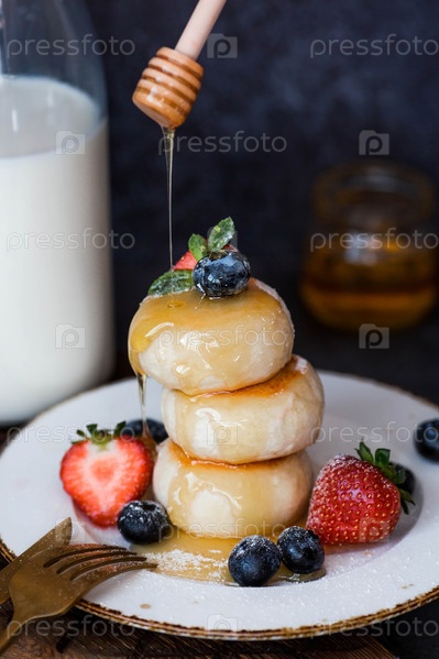 Блины с творогом, русские сырники со свежей черникой, клубникой, медом и листьями мяты на стильной деревянной доске на темном фоне. Натуральные продукты. Здоровый и вкусный завтрак