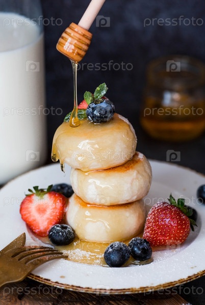 Блины с творогом, русские сырники со свежей черникой, клубникой, медом и листьями мяты на стильной деревянной доске на темном фоне. Натуральные продукты. Здоровый и вкусный завтрак