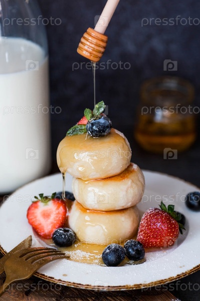 Блины с творогом, русские сырники со свежей черникой, клубникой, медом и листьями мяты на стильной деревянной доске на темном фоне. Натуральные продукты. Здоровый и вкусный завтрак