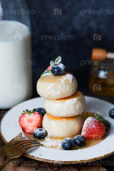 Блины с творогом, русские сырники со свежей черникой, клубникой, медом и листьями мяты на стильной деревянной доске на темном фоне. Натуральные продукты. Здоровый и вкусный завтрак