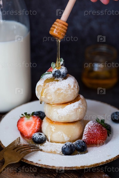 Блины с творогом, русские сырники со свежей черникой, клубникой, медом и листьями мяты на стильной деревянной доске на темном фоне. Натуральные продукты. Здоровый и вкусный завтрак