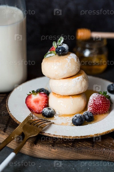 Блины с творогом, русские сырники со свежей черникой, клубникой, медом и листьями мяты на стильной деревянной доске на темном фоне. Натуральные продукты. Здоровый и вкусный завтрак