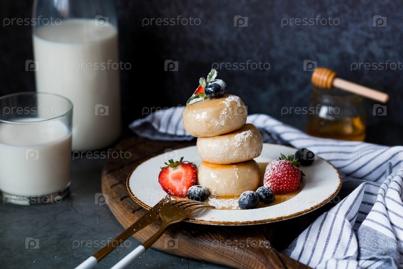 Блины с творогом, русские сырники со свежей черникой, клубникой, медом и листьями мяты на стильной деревянной доске на темном фоне. Натуральные продукты. Здоровый и вкусный завтрак