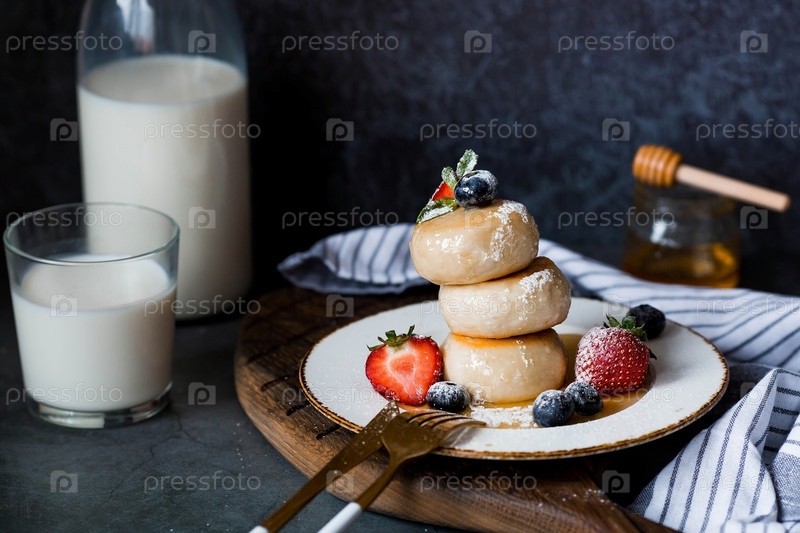 Блины с творогом, русские сырники со свежей черникой, клубникой, медом и листьями мяты на стильной деревянной доске на темном фоне. Натуральные продукты. Здоровый и вкусный завтрак