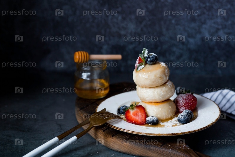 Блины с творогом, русские сырники со свежей черникой, клубникой, медом и листьями мяты на стильной деревянной доске на темном фоне. Натуральные продукты. Здоровый и вкусный завтрак