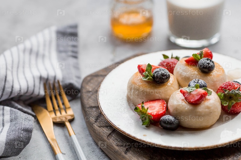Блины с творогом, русские сырники со свежей черникой, клубникой, медом и листьями мяты на стильной деревянной доске на сером бетонном столе. Натуральные продукты. Здоровый и вкусный завтрак