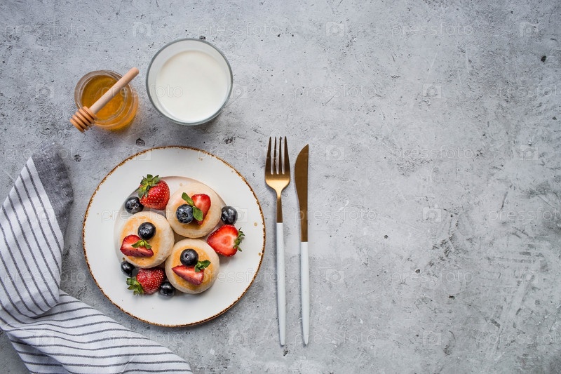 Блины с творогом, русские сырники со свежей черникой, клубникой, медом и листьями мяты на стильной деревянной доске на сером бетонном столе. Натуральные продукты. Здоровый и вкусный завтрак