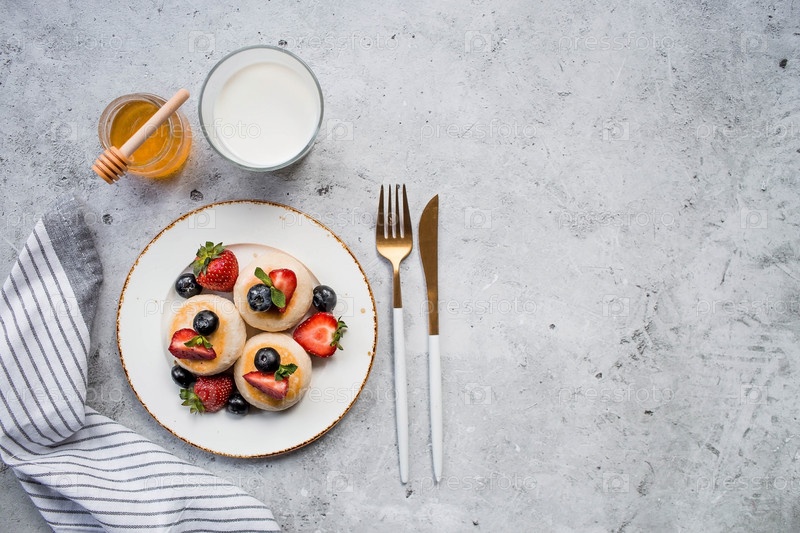 Блины с творогом, русские сырники со свежей черникой, клубникой, медом и листьями мяты на стильной деревянной доске на сером бетонном столе. Натуральные продукты. Здоровый и вкусный завтрак