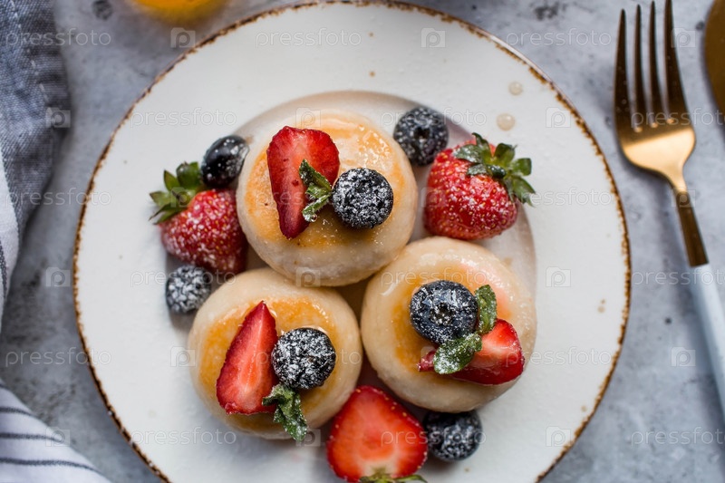 Блины с творогом, русские сырники со свежей черникой, клубникой, медом и листьями мяты на стильной деревянной доске на сером бетонном столе. Натуральные продукты. Здоровый и вкусный завтрак