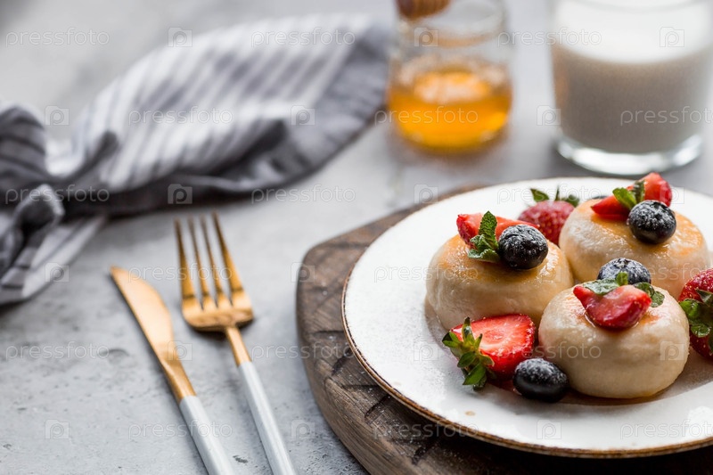 Блины с творогом, русские сырники со свежей черникой, клубникой, медом и листьями мяты на стильной деревянной доске на сером бетонном столе. Натуральные продукты. Здоровый и вкусный завтрак