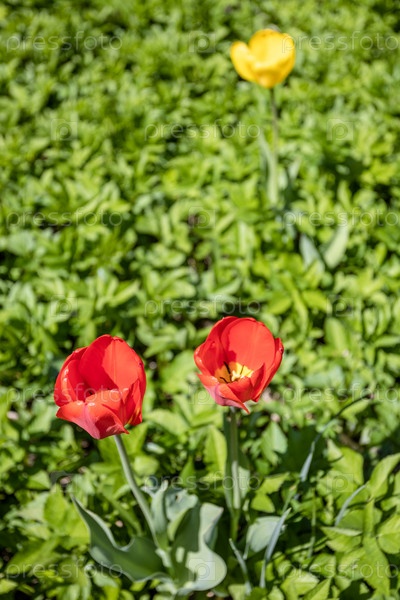 Пара красных тюльпанов цветы крупным планом на зеленом лугу